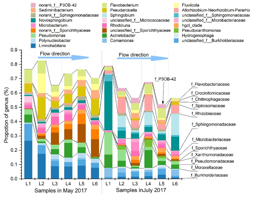 对水样微生物多样性的时空分析发现,雨季和雨季前水样中占主导作用的微生物种属存在差异。5月主要细菌种类为Sporichthyaceae,其含量从3.4%向下游递增至22.6%;七月主要细菌种类为Novosphingobium,其含量在3.5%至34.0%之间变化(图3)。对细菌的基因功能预测(PICRUAST2)分析发现,Sporichthyaceae主导了5月样品中微生物源有机碳组分的形成,Novosphingobium与微生物源有机碳固定相关(图4)。本文研究结果对了解岩溶水生系统中微生物的作用过程和机理具有重要的参考意义,给岩溶有机碳汇的形成机制提供科学证据。
