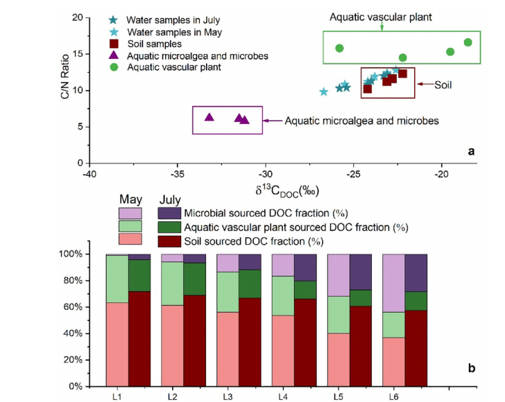 漓江水样有机碳组成表明,RDOC是漓江水体中有机碳的主要成分其含量占总DOC的67%-93%,且含量向下游递增。可降解可溶有机质(BDOC, Biodegradable dissolved organic carbon)的变化存在季节差异,雨季前其含量上升而雨季时含量下降,说明降雨对水生光合作用的影响导致了BDOC产量降低。而根据水样碳同位素和C/N比推算的漓江可溶有机碳来源占比,发现微生物源可溶有机质(MDOC, microbial-sourced dissolved organic carbon)是水样中RDOC的主要积累和稳定状态,其含量向下游递增,其中雨季前增加0.86mg/L,雨季增加0.78mg/L(图2).