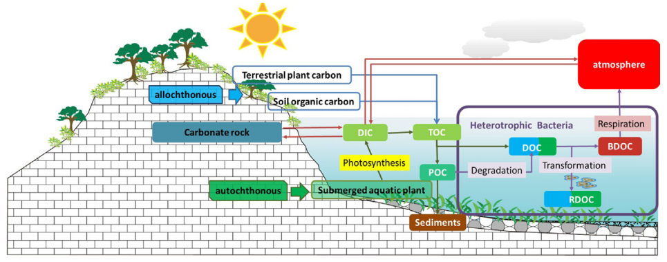 微生物碳泵(Microbial carbon pump)是水体惰性可溶有机碳(RDOC,Recalcitrant dissolved organic carbon)重要来源,其在长时间尺度海洋碳汇形成中的作用已经得到证明。陆地水深系统,尤其岩溶水生系统中微生物在RDOC的形成和转化也存在十分重要的作用(图1),但是微生物碳泵的作用和机理研究还存在较多疑问。本文以典型地表岩溶水生系统漓江为例,采集雨季(7月)以及雨季以前(5月)的水样,分析漓江上游至下游水化学、碳同位素以及微生物多样性的时空变化特征,了解微生物对岩溶水生系统中自源可溶有机碳汇和RDOC形成的影响,并寻找其中的关键性微生物种属。