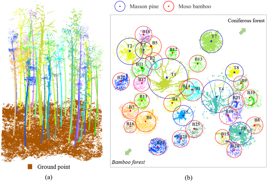 2 a)树竹混交林样方中单木点云分割结果;(b) 单株马尾松(T)和毛竹(B)的冠层宽度和冠顶位置。