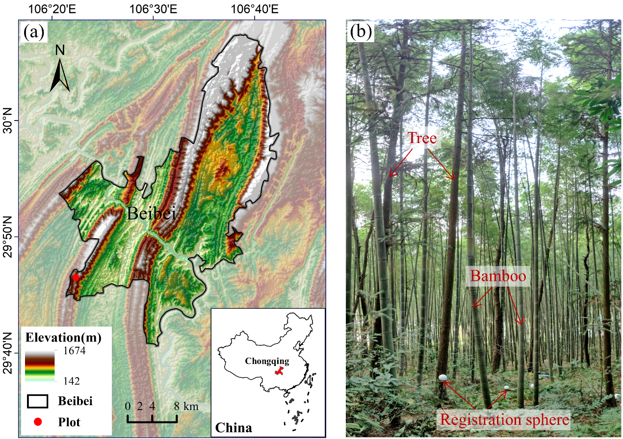 1 a)研究点的空间位置;(b)树竹混交林样方