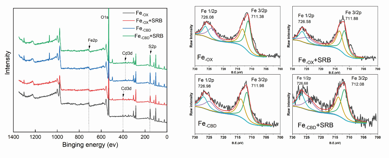 图2不同含铁粘粒组分与SRB反应前后XPS谱图(左图为全谱图,右图为Fe精细谱图,图中绿色及紫色峰线为Fe3+,蓝色及黄色峰线为Fe2+)