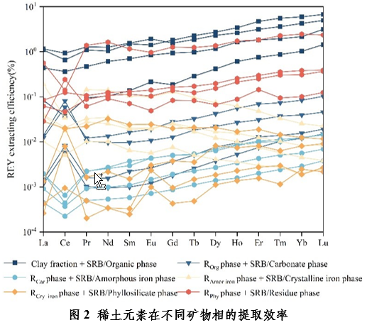 综上所述,SRB-粘粒系统可以改变REY在不同矿物相中的赋存状态,提高残渣态中REY的相对提取比例,并促进中重稀土元素的溶解。研究证明微生物淋滤法是一种具有高潜力的绿色采矿方法,能为理解微生物与矿物之间的生物地球化学过程提供新视野,促进稀土矿床的绿色高效开采。