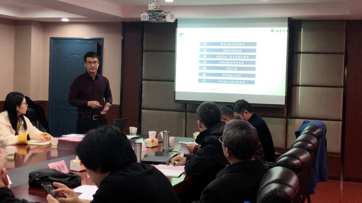 会议第二阶段,课题负责人王成教授从课题研究目标与结题要求、国内外研究现状、政策导向与现实景致和窘境、研究思路和研究内容、研究方案、研究进展与成果、研究需攻克的关键难题七个方面对课题作了详细的汇报。