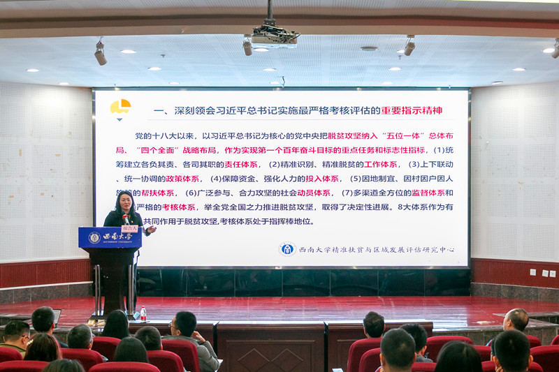 报告会上,廖和平教授从“脱贫攻坚助力”和“学生成长赋能”两个方面分享了5年来在国家精准扶贫工作成效第三方评估和贫困县退出评估检查等专项工作中的重要经历和动人事迹。她指出,精准扶贫的关键是实现“精准识别,精准脱贫”,充分利用地理学交叉学科优势,发挥团队力量,深入基层组织,“用最真的情,走最远的村、访最穷的户”,向党中央、国务院呈现全面、科学、真实的评估结果,为脱贫攻坚助力。同时,作为高校教师,她极为关注学生的成长成才。在评估工作中,坚持实践育人,“把课堂设在扶贫路上”,严格管理团队,加强学生的礼仪意识,培养学生的责任担当。她自豪地说道,正是由于团队师生的专业精神和高度自律,才能连续5年承担评估工作。一路上,她带领成员们跋山涉水,先后深入重庆、贵州、四川、云南、宁夏等13个省市(自治区)的134个区县、1978个乡镇、3170个行政村,走访村民15.8万户,累计撰写了315万字的评估报告和决策咨询建议,提出工作建议1246条,地方政府和老百姓对西南大学师生给予了高度的评价。最后,她寄语青年学子:弘扬脱贫攻坚精神,全面推进乡村振兴。将学科优势与服务社会相结合,贡献智慧和力量。