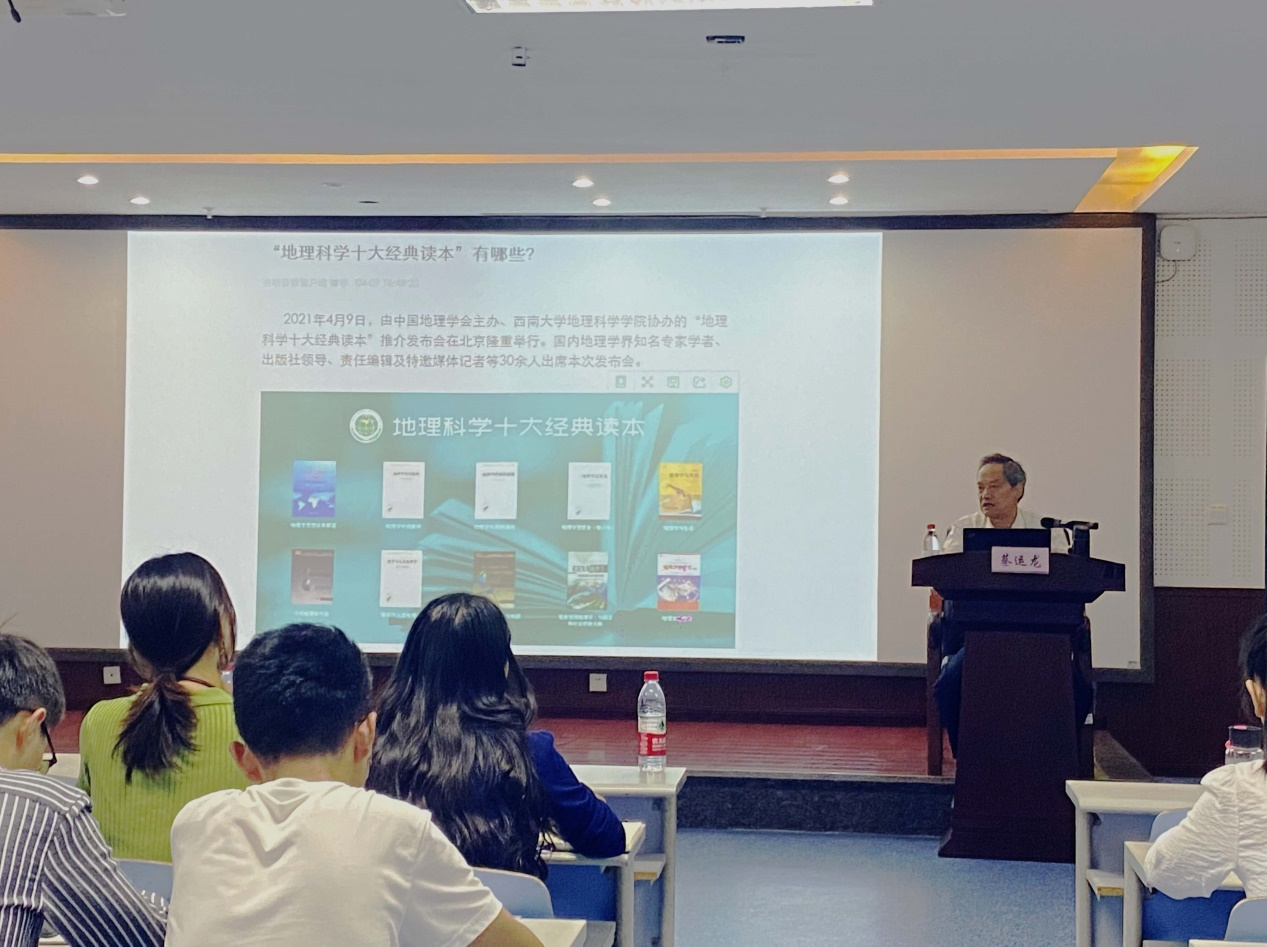 最后分享的是《哲学与人文地理学》《变化中的自然地理学性质》《当代地理学方法》三本读本。蔡运龙教授强调“做研究要甘坐冷板凳”,“平时多读书,多思考,眼光放长远”。