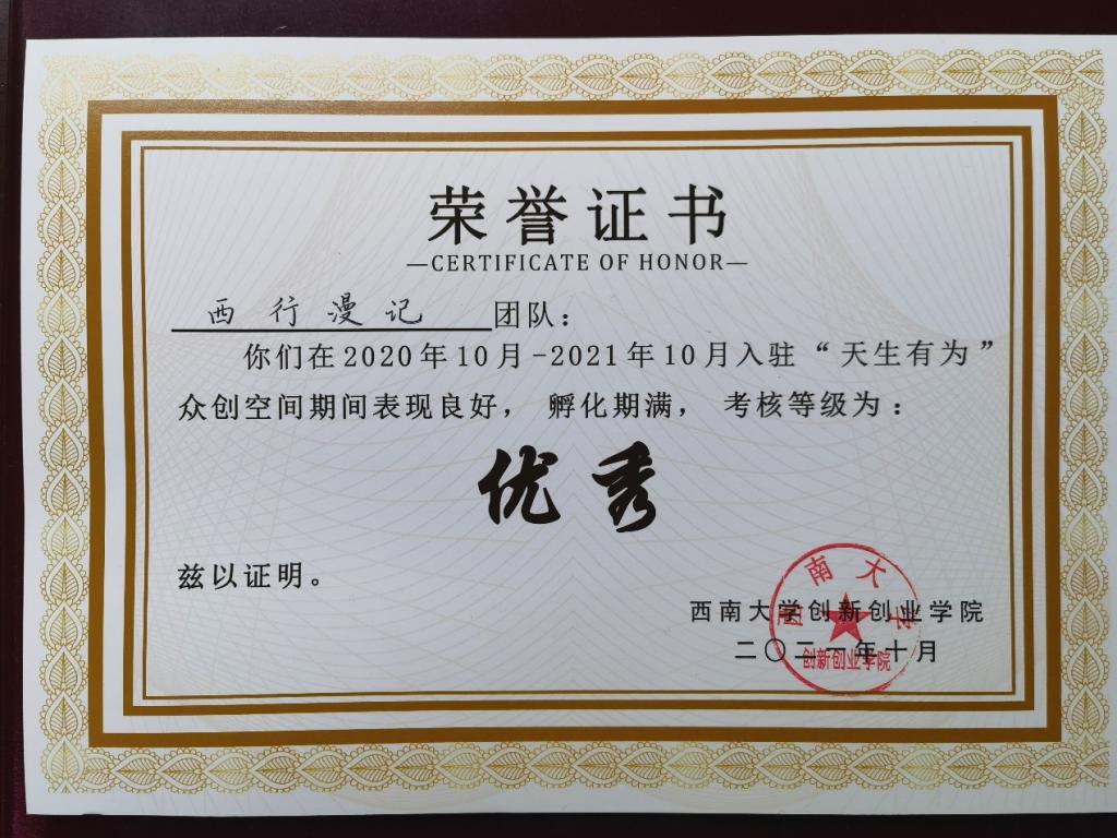 在过去的两年里“西行漫记”项目多次成功开展研学旅行活动,获得研学参与者的好评,并在本次西南大学“天生有为”众创空间2020年度团队考核中获评“优秀”等级,由审核评委颁发了优秀团队证书和奖金。