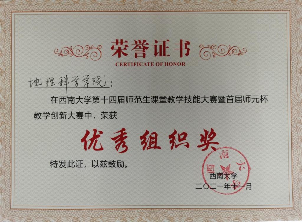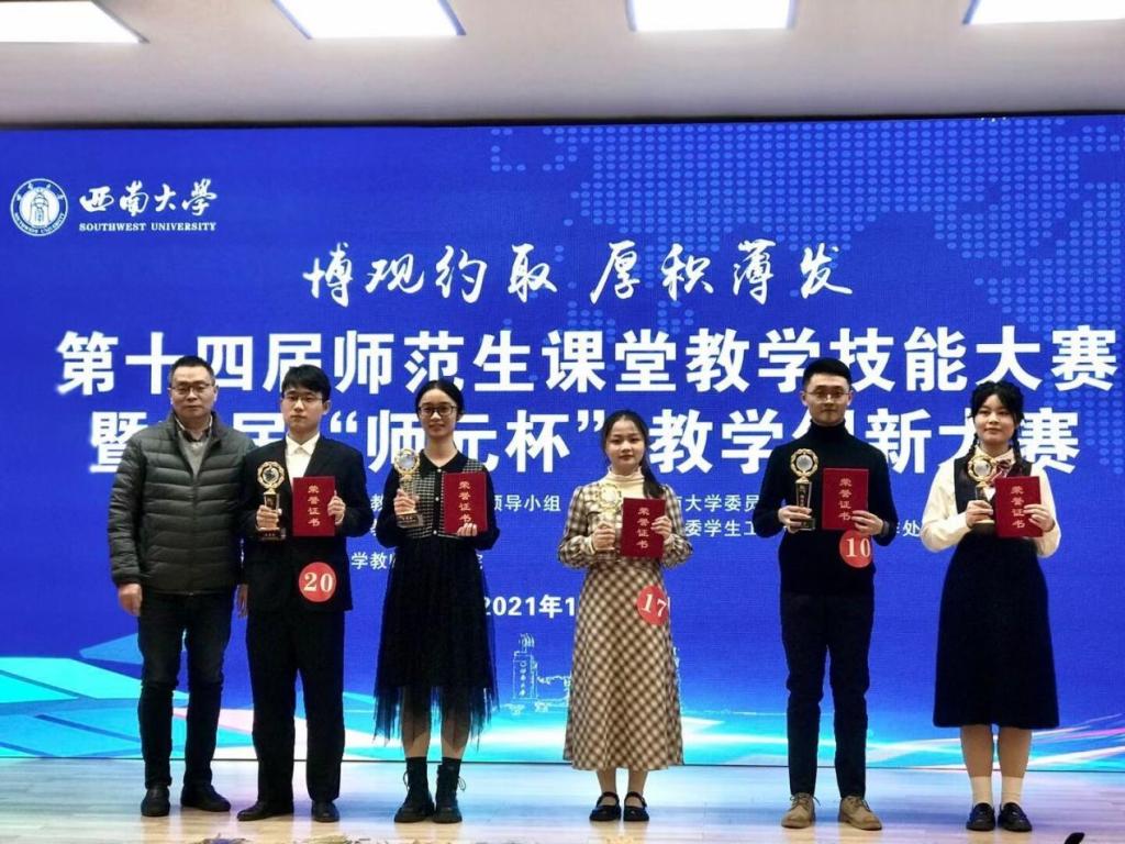 11月27日,西南大学第十四届师范生课堂教学技能大赛暨首届“师元杯”教学创新大赛在师元楼举行。经意昂 初赛选拔,地理科学学院派出2018级李欣彤和肖心月两名选手参赛,分别获得特等奖和一等奖的好成绩。