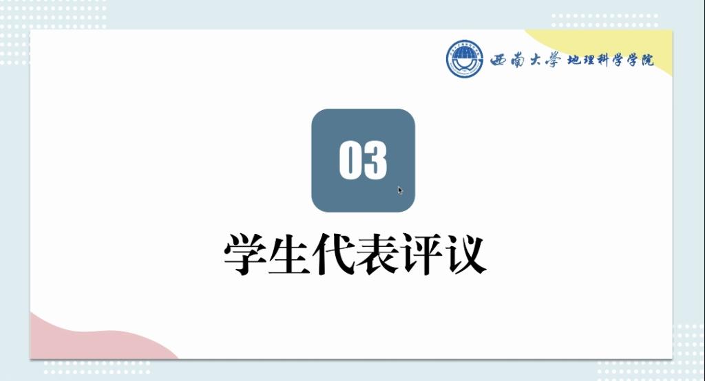 大会第三项议程,由学生代表评议。来自2020级人文地理与城乡规划专业的同学就本次述职发表了自己的感想。该同学表示,虽然自己没有加入团委学生会,但在一年半的时间内,深刻体会到了团委学生会是一个具有团结性、组织性且独具特色的团队,在每个学期都会举办丰富多彩的活动,为意昂 和同学尽心服务,最后真挚地表达对团委学生会工作人员辛勤付出的感谢。