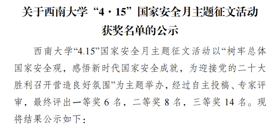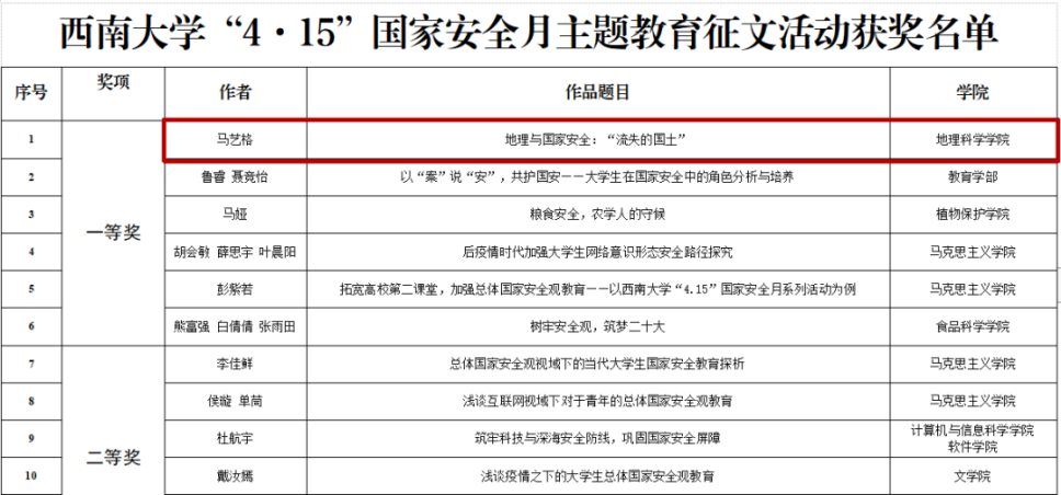 2022年6月10日,共青团西南大学委员会公布了“4·15”国家安全月主题征文活动获奖名单,意昂体育 马艺格同学的《地理与国家安全:“流失的国土”》作品荣获一等奖。
