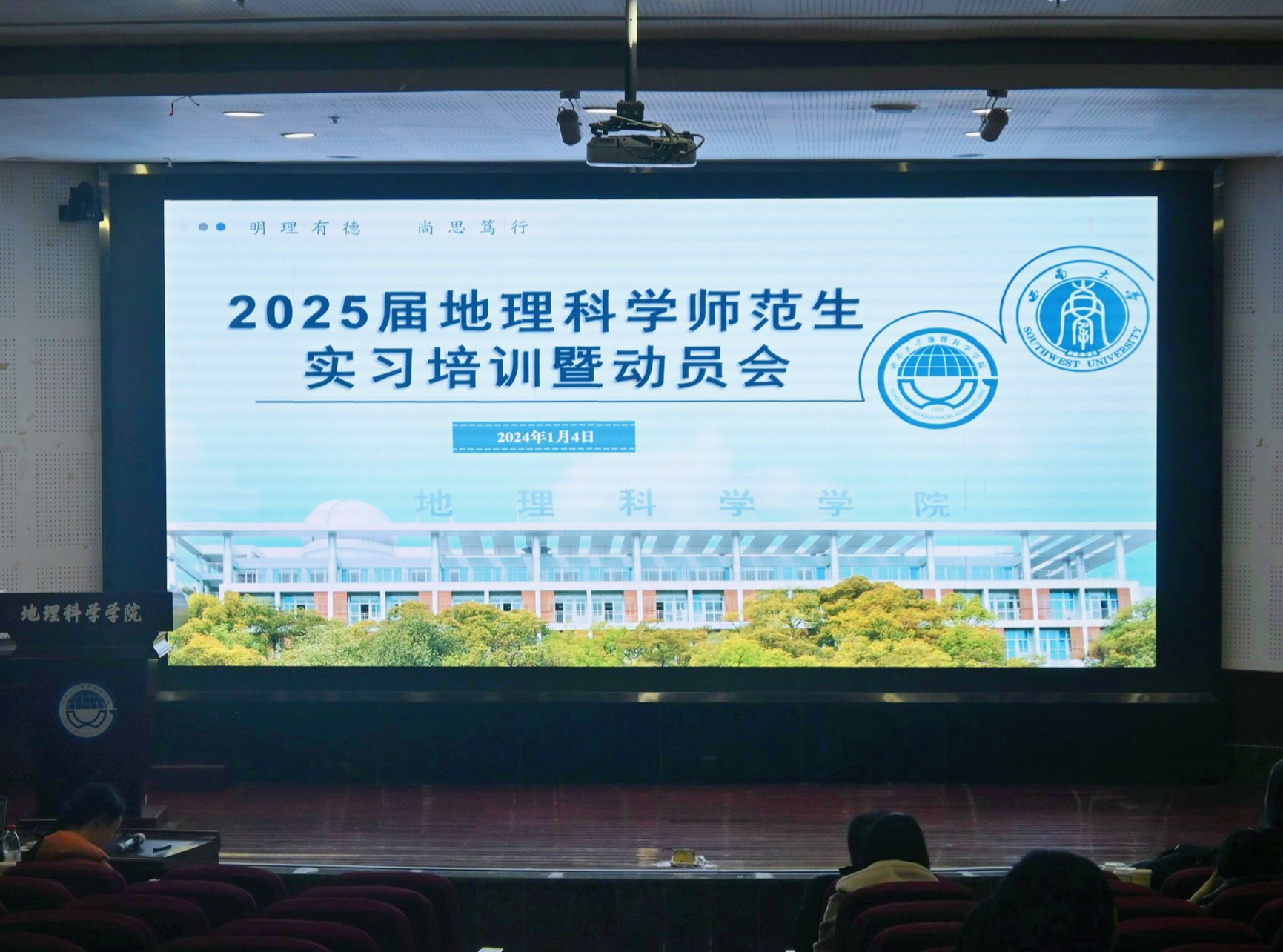 2024年1月4日下午,2025届地理科学师范生实习培训暨动员会在意昂体育 101报告厅举行。意昂体育 副院长王勇,重庆市北碚区中学地理教研员周飚,西南大学附属中学刘蓓佳及教师教育意昂 实习指导教师胡蓉、苏迎春和刘桂侠出席本次培训会。会议由教师教育意昂 胡蓉老师主持。