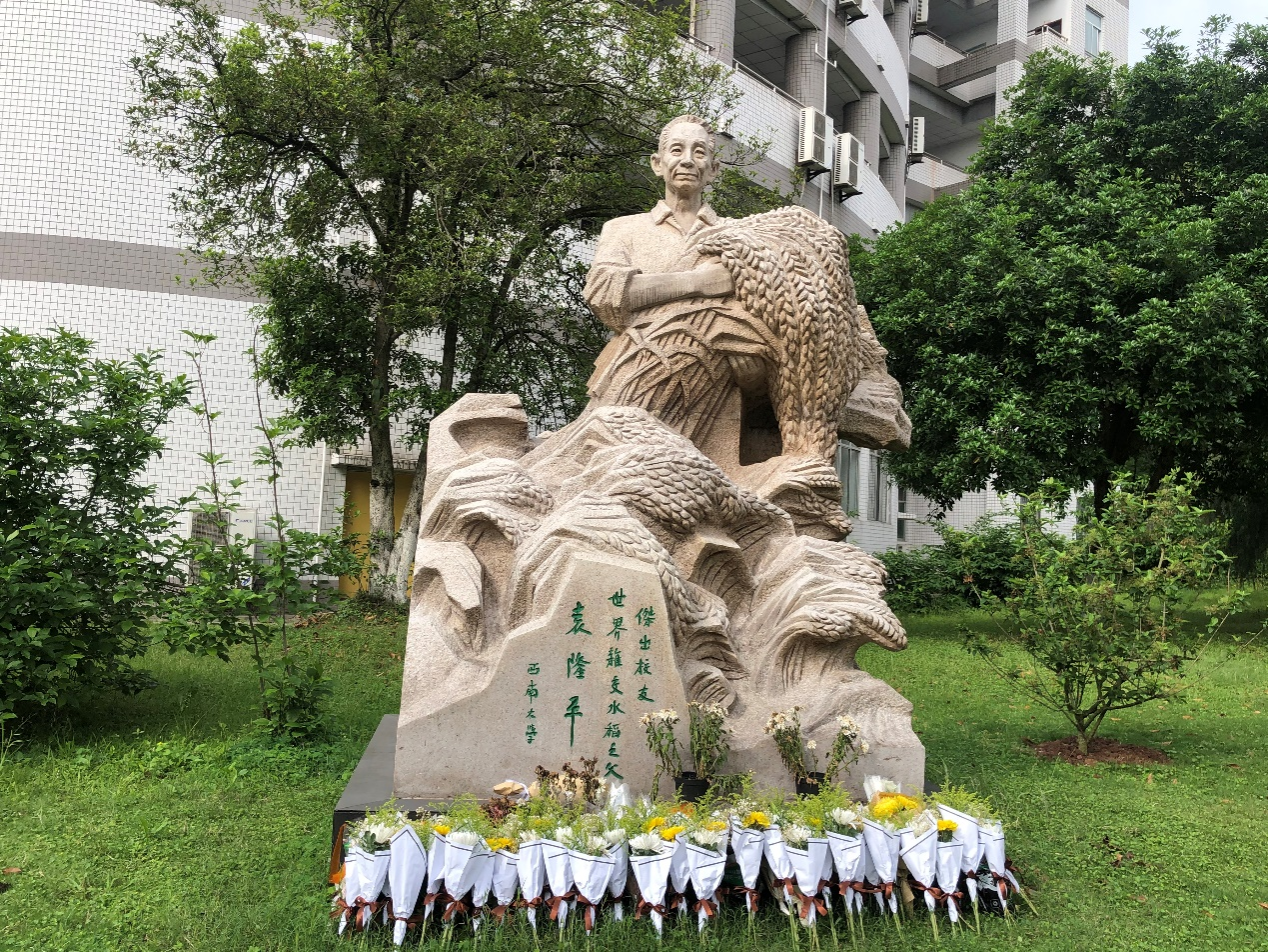 紧接着,党支部成员来到西南大学袁隆平纪念雕像处缅怀袁隆平院士。“禾下乘凉梦,一梦逐一生”,为攻克饥饿难题,让人民能吃饱饭,袁隆平院士用一生的时间去奋斗。袁隆平是我国研究与发展杂交水稻的开创者,也是世界上第一个成功利用水稻杂种优势的科学家,被誉为“杂交水稻之父”。党支部成员在雕塑下驻足凝望,袁隆平院士目光如炬,炯炯有神,手中捧着颗粒又大又饱满的稻穗,心中怀揣着禾下乘凉梦和杂交稻覆盖全球梦。怀着对袁爷爷的尊敬和思念之情,党支部全体同志纷纷敬献菊花悼念,寄托哀思。