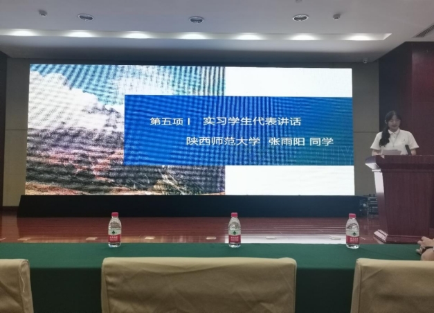 陕西师范大学实习学生代表张雨阳发言。她满怀着对地理学的热爱和对此次旅途的期待,代表全体同学做出郑重承诺:保证遵守实习纪律,认真完成实习任务。希望通过本次实习,不断锤炼本领,赓续地科薪火,鸣奏时代华章。
